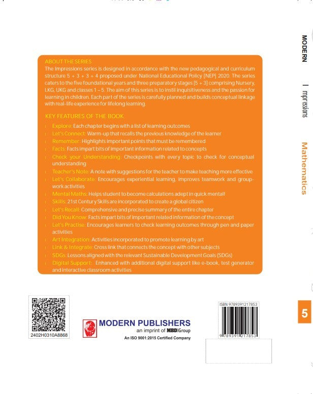 The Impressions series is designed in accordance with the new pedagogical and curriculum structure 5 + 3 + 3 + 4 proposed under National Educational Policy (NEP) 2020. The series caters to the five foundational years and three preparatory stages (5+ 3) comprising Nursery, LKG, UKG and classes 1-5. The aim of this series is to instil inquisitiveness and the passion for learning in children. Each part of the series is carefully planned and builds conceptual linkage with real-life experience for lifelong learning.