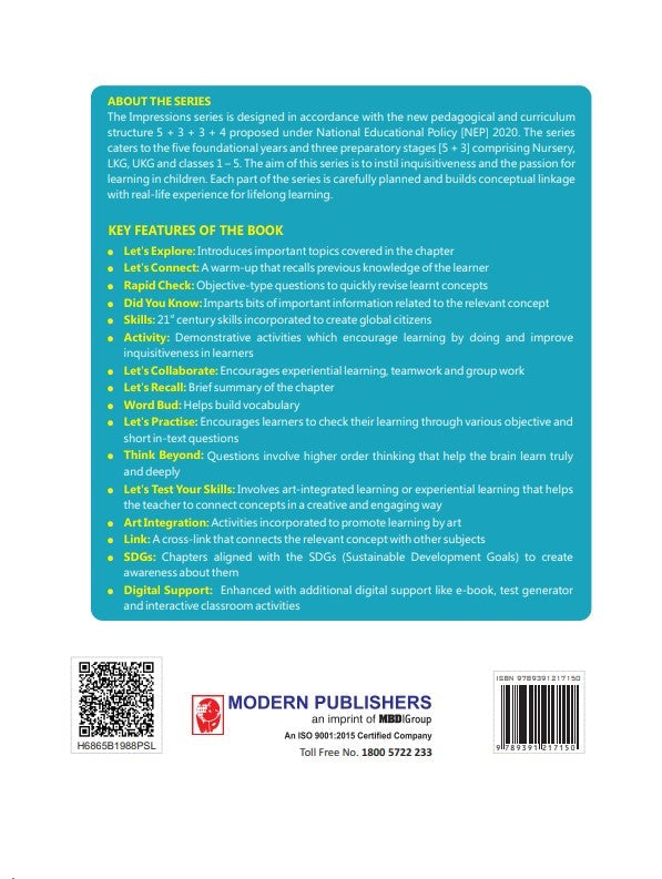 The Impressions series is designed in accordance with the new pedagogical and curriculum structure 5 + 3 + 3 + 4 proposed under National Educational Policy [NEP] 2020. The series caters to the five foundational years and three preparatory stages [5+ 3] comprising Nursery, LKG, UKG and classes 1-5. The aim of this series is to instil inquisitiveness and the passion for learning in children. Each part of the series is carefully planned and builds conceptual linkage with real-life experience for lifelong learning.