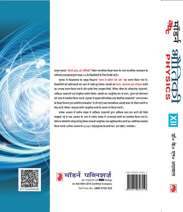 About the book:-The presented book 'Modern ABC of Physics' has been written for the students of class XII as per the latest syllabus of the Higher Secondary Course of Bihar Board of Secondary Education. The main principle of pedagogy 'from simple to difficult' has been followed in the book. Keeping in mind the difficulties of the students, every effort has been made to make the subject matter simple, understandable and interesting and for this, suitable pictures, numerous examples of daily life, inferential examples and balanced sufficient subject matter have been included in a modern way in simple, easy and colloquial language. The technical and scientific terminology used in the book has been taken from the 'Dictionary certified by the Education Department of the Government of India' and the relevant English words have also been given at appropriate places. The subject matter has been described on the basis of modern facts. In each chapter, the method of solving numerical questions has been explained by sufficient number of numerical examples and sufficient number of practice questions have been included at the end of the chapter. Subject related objective and multiple choice questions have been additionally included for various competitive exams. Questions from NCERT textbooks (with solutions) are included in every chapter.
