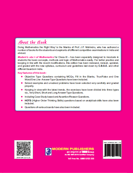 Modern's abc + of Mathematics for Class-XI- has been especially designed to inculcate in students the basic concepts, methods and logic of Mathematics easily. For better practice and keeping in line with the recent modifications, this edition has been reviewed, revised, updated, and graded with the new syllabus, curriculum and guidelines laid down by C.B.S.E. and other different boards in India.