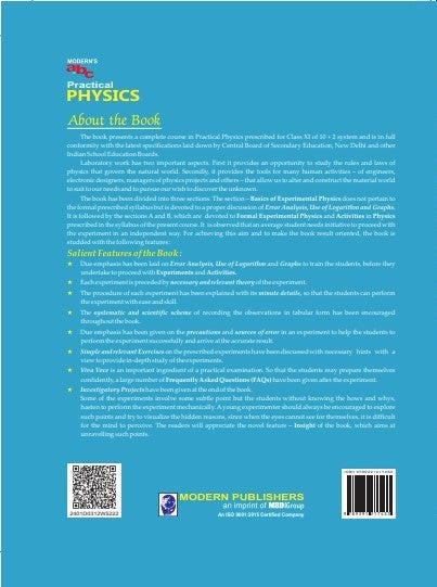 The book presents a complete course in Practical Physics prescribed for Class XI of 10 + 2 system and is in full conformity with the latest specifications laid down by Central Board of Secondary Education, New Delhi and other Indian School Education Boards.