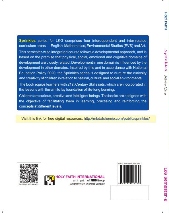 Sprinkles series for LKG comprises four interdependent and inter-related curriculum areas—English, Mathematics, Environmental Studies (EVS) and Art. This semester-wise integrated course follows a developmental approach, and is based on the...