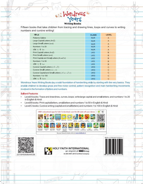 • Level A books: Trace and draw lines, curves, loops; write large capital and small letters; and numbers 1 to 20 in English & Hindi