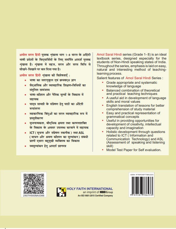 Amol Saral Hindi series (Grade 1- 8) is an ideal textbook series, designed especially for the students of Non-Hindi speaking states of India. Throughout the series, emphasis is laid on easy, natural and interesting method of teaching learning process. Salient features of Amol Saral Hindi Series :