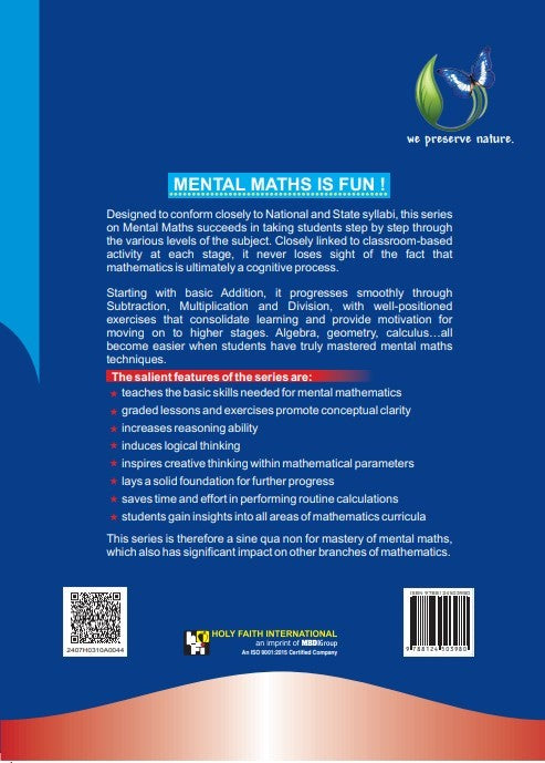 Designed to conform closely to National and State syllabi, this series on Mental Math's succeeds in taking students step by step through the various levels of the subject. Closely linked to classroom-based activity at each stage, it never loses sight of the fact that mathematics is ultimately a cognitive process. Starting with basic Addition, it progresses smoothly through Subtraction, Multiplication and Division, with well-positioned exercises that consolidate learning and provide motivation for moving on to higher stages. Algebra, geometry, calculus all become easier when students have truly mastered mental math's techniques. The salient features of the series are: teaches the basic skills needed for mental mathematics graded lessons and exercises promote conceptual clarity increases reasoning ability induces logical thinking inspires creative thinking within mathematical parameters lays a solid foundation for further progress saves time and effort in performing routine calculations students gain insights into all areas of mathematics curricula. This series is therefore a sine qua non for mastery of mental math's, which also has significant impact on other branches of mathematics.