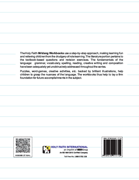 The Holy Faith Mridang Workbooks use a step-by-step approach, making learning fun and relieving children from the drudgery of rote learning. The literature portion pertains to the textbook-based questions and revision exercises. The fundamentals of the language: grammar, vocabulary, spelling, reading, creative writing and composition have been adequately yet unobtrusively addressed throughout the series.
