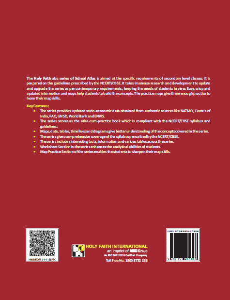 The Holy Faith abc series of School Atlas is aimed at the specific requirements of secondary level classes. It is prepared on the guidelines prescribed by the NCERT/CBSE. It takes immense research and development to update and upgrade the series as per contemporary requirements, keeping the needs of students in view. Easy, crisp and updated information and maps help students to build the concepts. The practice maps give them enough practice to hone their map skills.