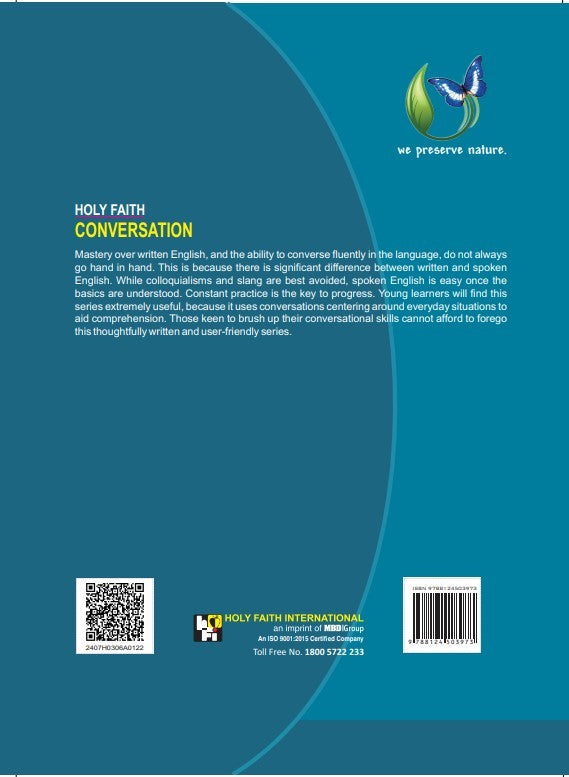 HOLY FAITH CONVERSATION Mastery over written English, and the ability to converse fluently in the language, do not always go hand in hand. This is because there is significant difference between written and spoken English. While colloquialisms and slang are best avoided, spoken English is easy once the basics are understood. Constant practice is the key to progress. Young learners will find this series extremely useful, because it uses conversations centering around everyday situations to aid comprehension. Those keen to brush up their conversational skills cannot afford to forego this thoughtfully written and user-friendly series.