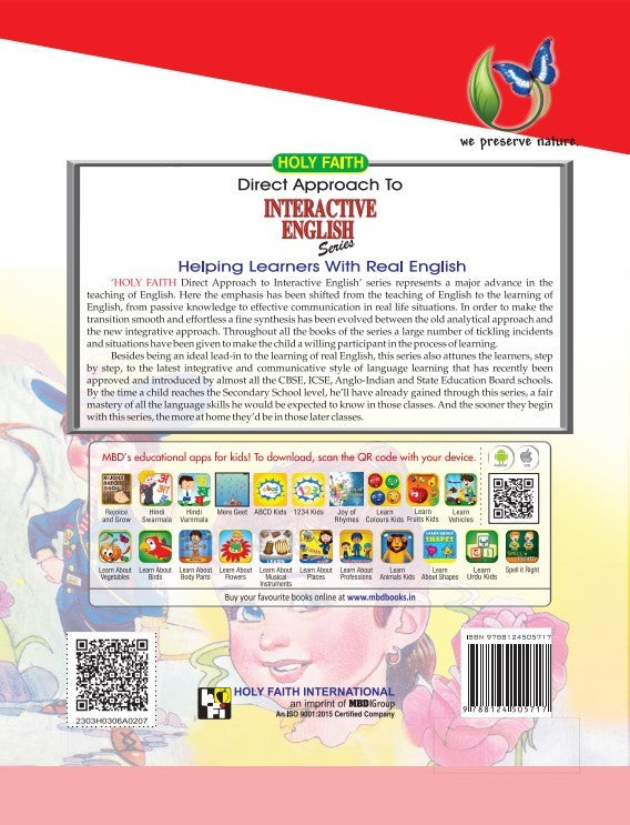 ‘HOLY FAITH Direct Approach to Interactive English’ series represents a major advance in the teaching of English. Here the emphasis has been shifted from the teaching of English to the learning of English, from passive knowledge to effective communication in real life situations. In order to make the transition smooth and effortless a fine synthesis has been evolved between the old analytical approach and the new integrative approach. Throughout all the books of the series a large number of tickling incidents and situations have been given to make the child a willing participant in the process of learning. Besides being an ideal lead-in to the learning of real English, this series also attunes the learners, step by step, to the latest integrative and communicative style of language learning that has recently been approved and introduced by almost all the CBSE, ICSE, Anglo-Indian and State Education Board schools. By the time a child reaches the Secondary School level, he’ll have already gained through this series, a fair mastery of all the language skills he would be expected to know in those classes.