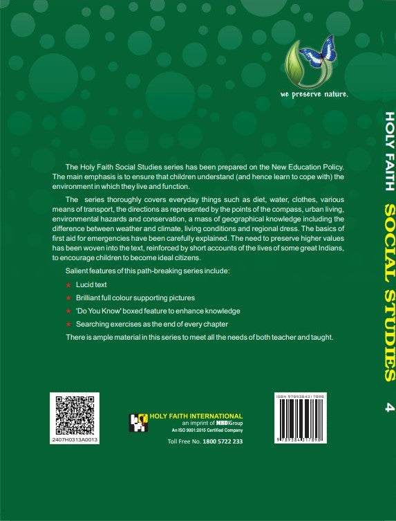 The Holy Faith Social Studies series has been prepared on the New Education Policy. The main emphasis is to ensure that children understand (and hence learn to cope with) the environment in which they live and function. The series thoroughly covers everyday things such as diet, water, clothes, various means of transport, the directions as represented by the points of the compass, urban living, environmental hazards and conservation, a mass of geographical knowledge including the difference between weather and climate, living conditions and regional dress. The basics of first aid for emergencies have been carefully explained. The need to preserve higher values has been woven into the text, reinforced by short accounts of the lives of some great Indians, to encourage children to become ideal citizens. Salient features of this path-breaking series include: