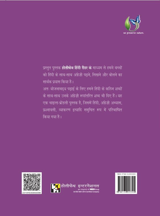प्रस्तुत पुस्तक होलीफेथ हिंदी रीडर के माधयम से हमने बच्चों को हिंदी के साथ-साथ अंग्रेजी पढने, लिखने और बोलने का सार्थक प्रयास किया है। अतः योजनाबदध पढाई के लिए हमने हिंदी के कठिन शब्दों के साथ-साथ उनके अंग्रेजी रूपांतरित शब्द भी दिए हैं। यह एक चाइल्ड-फ्रेंडली पुस्तक है, जिसमें हिंदी, अंग्रेजी अभ्यास, प्रश्नावली, व्याकरण इत्यादि समुचित रूप में परिभाषित किया गया है।