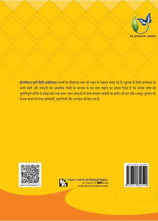 होलीपफ़ेथ पूर्ण हिंदी प्रवेशिका बच्चों के बौद्धिक स्तर को ध्यान में रखकर बनाई गई है। पुस्तक में हिंदी वर्णमाला के सभी स्वरों और व्यंजनों को आकर्षक चित्रों के माध्यम से इस तरह पढ़ाने का प्रयास किया है कि बच्चा भाषा को सुरूचिपूर्ण तरीके से सीख सके तथा साथ-साथ मात्राओं से शब्द बनाकर वाक्यों का प्रयोग भी कर सके। प्रस्तुत पुस्तक को रोचक बनाने वफ़े लिए कविताएँ, कहानियाँ और अभ्यास भी दिए गए हैं।