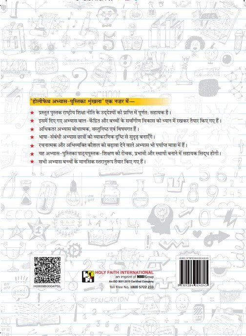 ‘होलीफेथ अभ्यास-पुस्तिका शृंखला’ एक नजर में प्रस्तुत पुस्तक राष्ट्रीय शिक्षा नीति के उद्देश्यों की प्राप्ति में पूर्णतः सहायक है। इसमें दिए गए अभ्यास बाल-केंद्रित और बच्चों के सर्वांगीण विकास को ध्यान में रखकर तैयार किए गए हैं। अधिकतर अभ्यास बोधात्मक, वस्तुनिष्ठ एवं विषयगत हैं। भाषा-संबंधी अभ्यास छात्रें को व्याकरणिक दृष्टि से सुदृढ़ बनाएँगे। रचनात्मक और अभिव्यक्ति कौशल को बढ़ावा देने वाले अभ्यास भी पर्याप्त मात्र में हैं। यह अभ्यास-पुस्तिका पाठ्यपुस्तक-शिक्षण को रोचक, प्रभावी और स्थायी बनाने में सहायक सिद्ध होगी। सभी अभ्यास बच्चों के मानसिक स्तरानुरूप तैयार किए गए हैं।