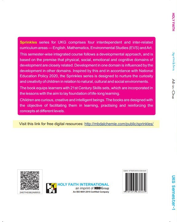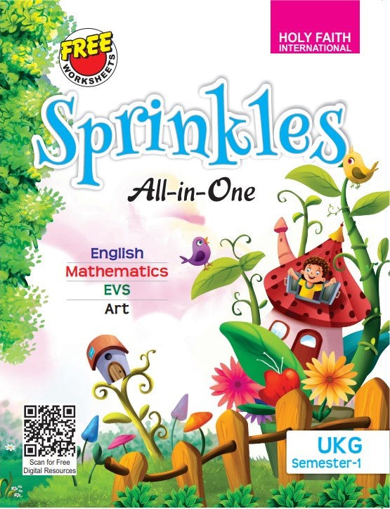 Sprinkles series for UKG comprises four interdependent and inter-related curriculum areas-English, Mathematics, Environmental Studies (EVS) and Art. This semester-wise integrated course follows a developmental approach, and is based on the premise that physical, social, emotional and cognitive domains of development are closely related. Development in one domain is influenced by the development in other domains. Inspired by this and in accordance with National Education Policy 2020, the Sprinkles series is designed to nurture the curiosity and creativity of children in relation to natural, cultural and social environments. The book equips learners with 21st Century Skills sets, which are incorporated in the lessons with the aim to lay foundation of life-long learning.