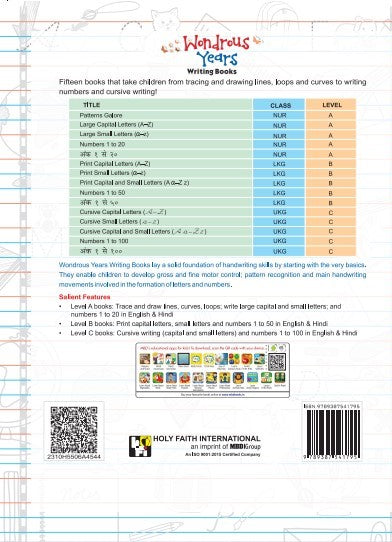 • Level A books: Trace and draw lines, curves, loops; write large capital and small letters; and numbers 1 to 20 in English & Hindi