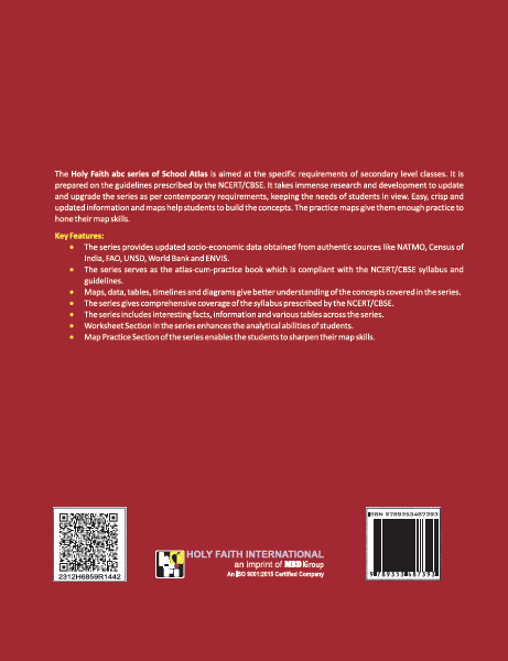 The Holy Faith abc series of School Atlas is aimed at the specific requirements of secondary level classes. It is prepared on the guidelines prescribed by the NCERT/CBSE. It takes immense research and development to update and upgrade the series as per contemporary requirements, keeping the needs of students in view. Easy, crisp and updated information and maps help students to build the concepts. The practice maps give them enough practice to hone their map skills.