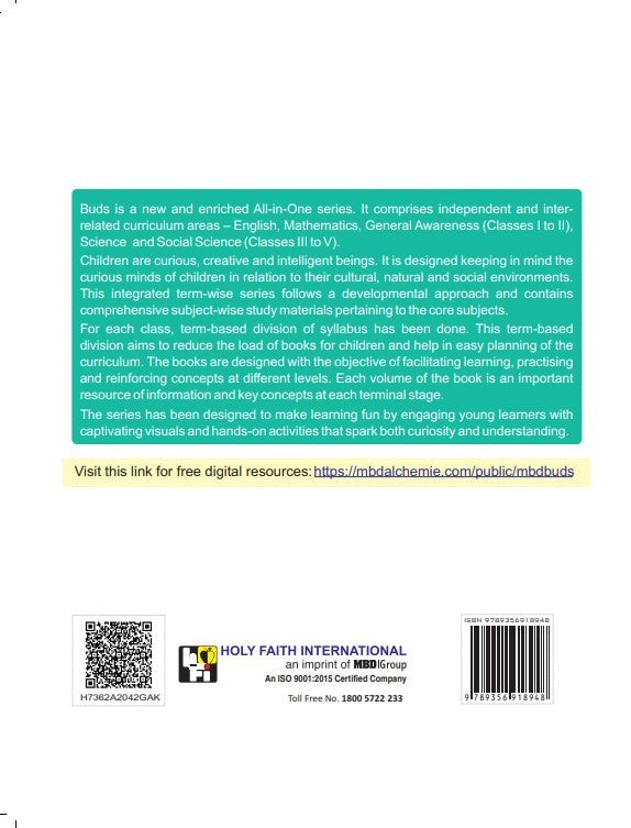 About :- Buds is a new and enriched All-in-One series. It comprises independent and inter- related curriculum areas - English, Mathematics, General Awareness (Classes I to II), Science and Social Science (Classes III to V). Children are curious, creative and intelligent beings. It is designed keeping in mind the curious minds of children in relation to their cultural, natural and social environments. This integrated term-wise series follows a developmental approach and contains comprehensive subject-wise study materials pertaining to the core subjects. For each class, term-based division of syllabus has been done. This term-based division aims to reduce the load of books for children and help in easy planning of the curriculum. The books are designed with the objective of facilitating learning, practicing and reinforcing concepts at different levels. Each volume of the book is an important resource of information and key concepts at each terminal stage. The series has been designed to make learning fun by engaging young learners with captivating visuals and hands-on activities that spark both curiosity and understanding.