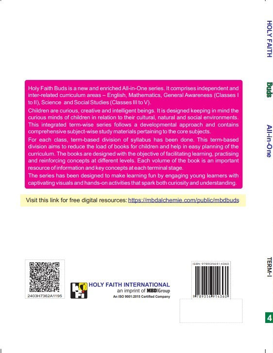 Holy Faith Buds is a new and enriched All-in-One series. It comprises independent and inter-related curriculum areas - English, Mathematics, General Awareness (Classes I to II), Science and Social Studies (Classes III to V). Children are curious, creative and intelligent beings. It is designed keeping in mind the curious minds of children in relation to their cultural, natural and social environments. This integrated term-wise series follows a developmental approach and contains comprehensive subject-wise study materials pertaining to the core subjects. For each class, term-based division of syllabus has been done. This term-based division aims to reduce the load of books for children and help in easy planning of the curriculum. The books are designed with the objective of facilitating learning, practicing and reinforcing concepts at different levels. Each volume of the book is an important resource of information and key concepts at each terminal stage. The series has been designed to make learning fun by engaging young learners with captivating visuals and hands-on activities that spark both curiosity and understanding.