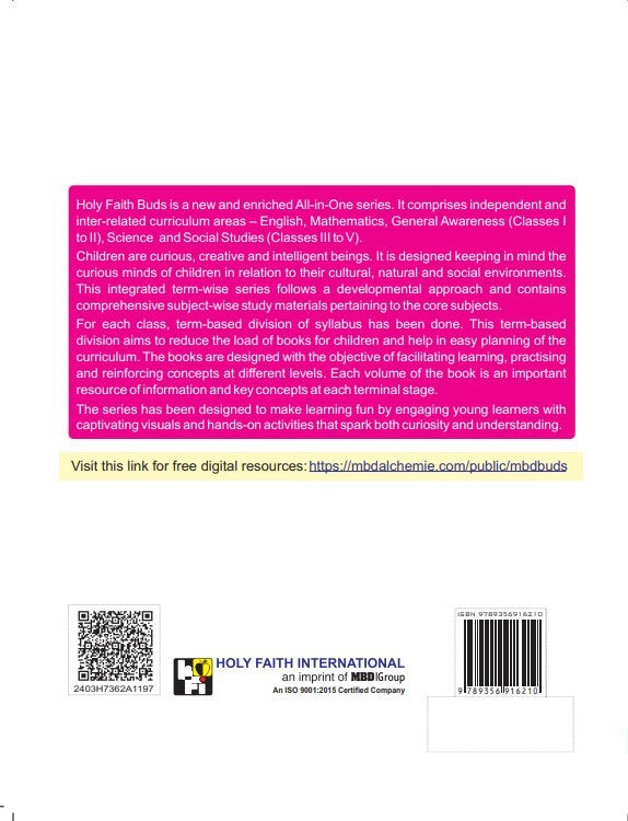 Holy Faith Buds is a new and enriched All-in-One series. It comprises independent and inter-related curriculum areas - English, Mathematics, General Awareness (Classes I to II), Science and Social Studies (Classes III to V). Children are curious, creative and intelligent beings. It is designed keeping in mind the curious minds of children in relation to their cultural, natural and social environments. This integrated term-wise series follows a developmental approach and contains comprehensive subject-wise study materials pertaining to the core subjects.
