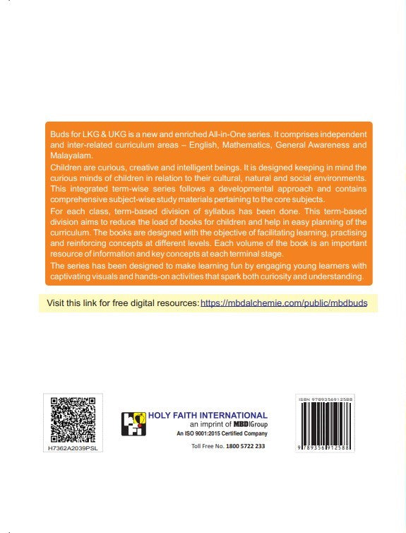 About:- Buds for LKG & UKG is a new and enriched All-in-One series. It comprises independent and inter-related curriculum areas - English, Mathematics, General Awareness and Malayalam. Children are curious, creative and intelligent beings. It is designed keeping in mind the curious minds of children in relation to their cultural, natural and social environments. This integrated term-wise series follows a developmental approach and contains comprehensive subject-wise study materials pertaining to the core subjects. For each class, term-based division of syllabus has been done. This term-based division aims to reduce the load of books for children and help in easy planning of the curriculum. The books are designed with the objective of facilitating learning, practicing and reinforcing concepts at different levels. Each volume of the book is an important resource of information and key concepts at each terminal stage. The series has been designed to make learning fun by engaging young learners with captivating visuals and hands-on activities that spark both curiosity and understanding.